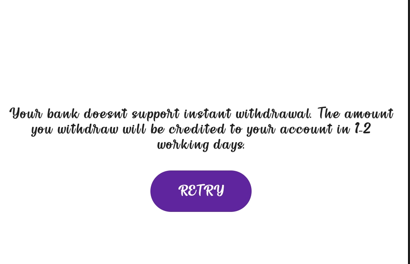 2.1 | Error screen says: ‘Bank doesn't support instant withdrawal.’ | Inform the user that we will raise this with the concerned team to check on what happened, and will give you an update before <current date + 3 Working Days>.